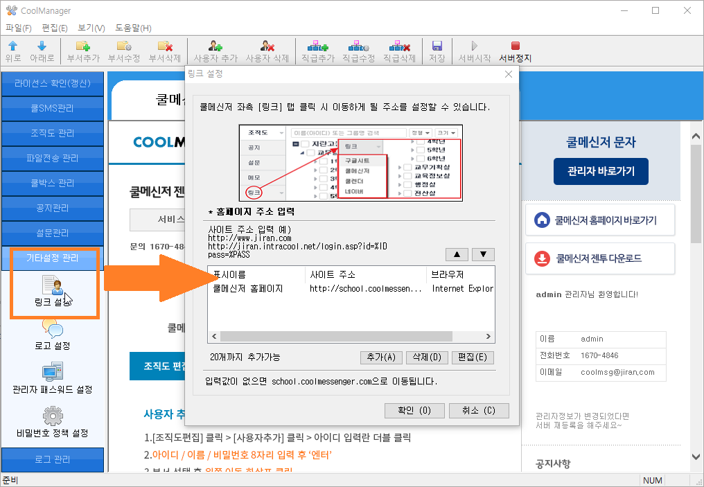 쿨메신저 좌측 '링크'탭에 원하는 홈페이지 주소를 넣으시려면 쿨매니저서버에서 작업 부탁드립니다.